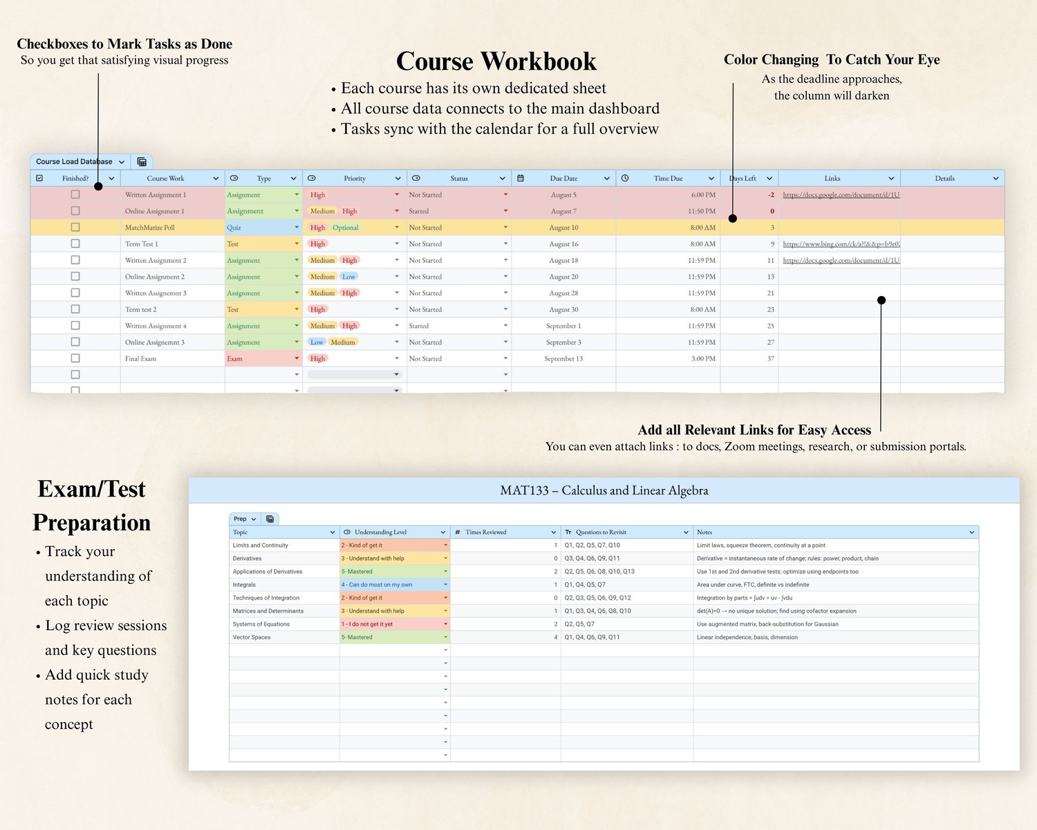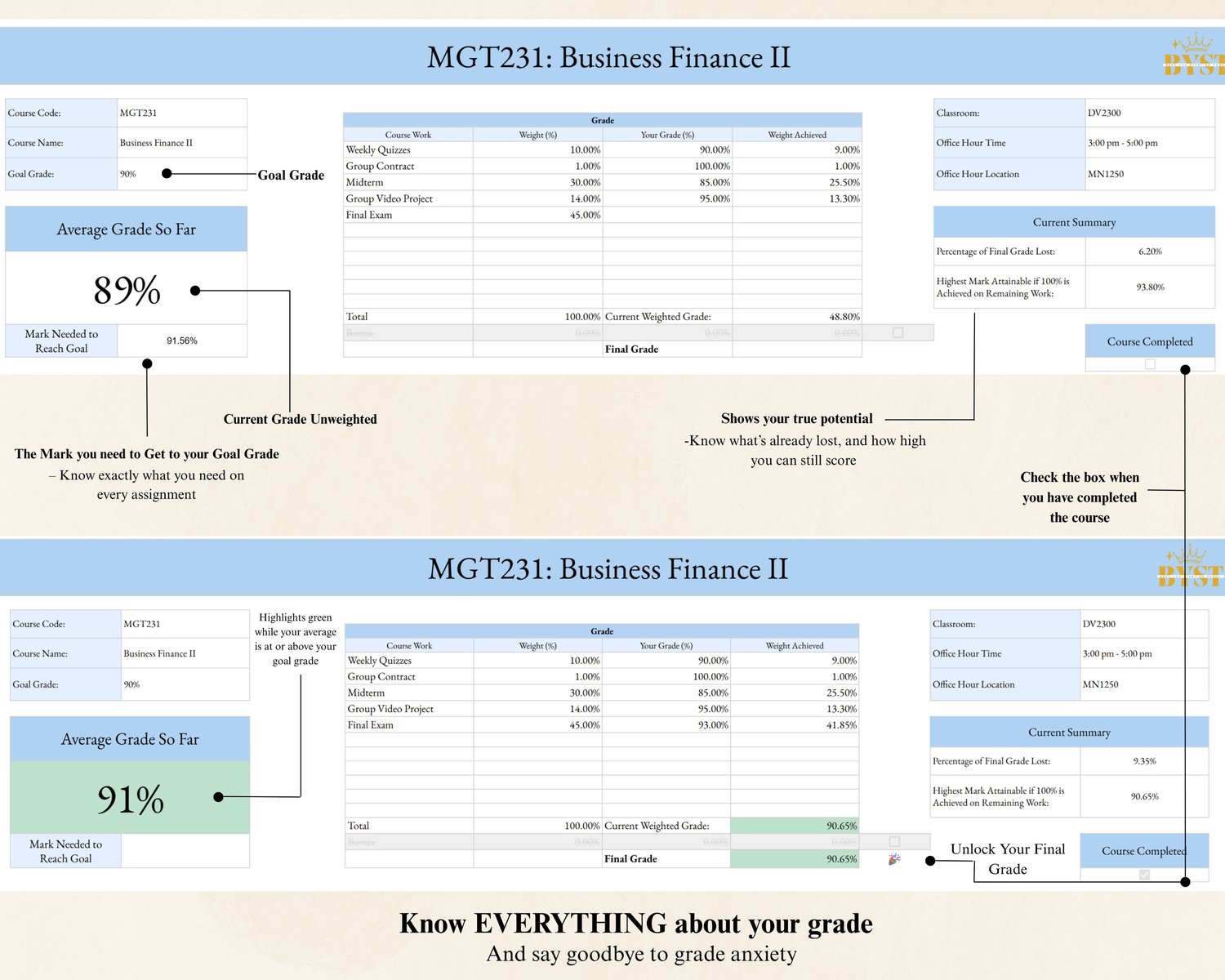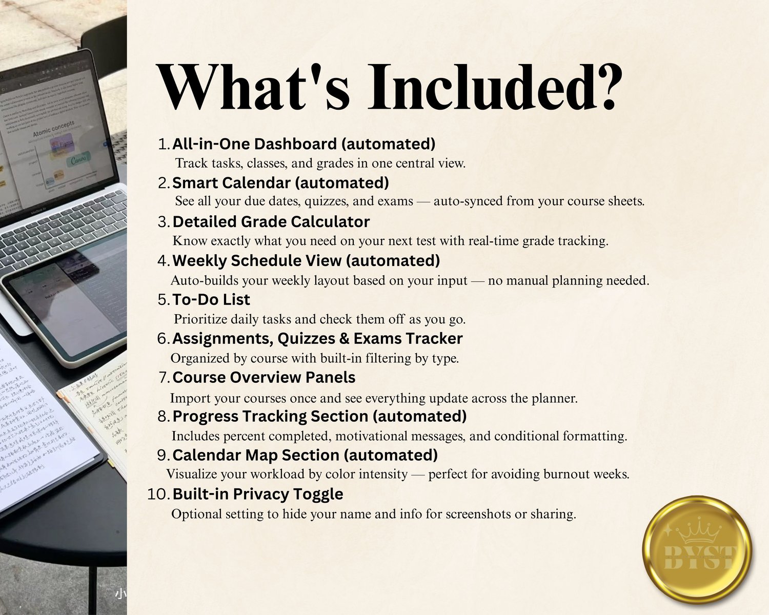 This fully automated student planner was built to help you take control of your courses with clarity and confidence. From grade tracking to task management, everything is organized, color-coded, and connected, so you can focus on learning, not stressing.