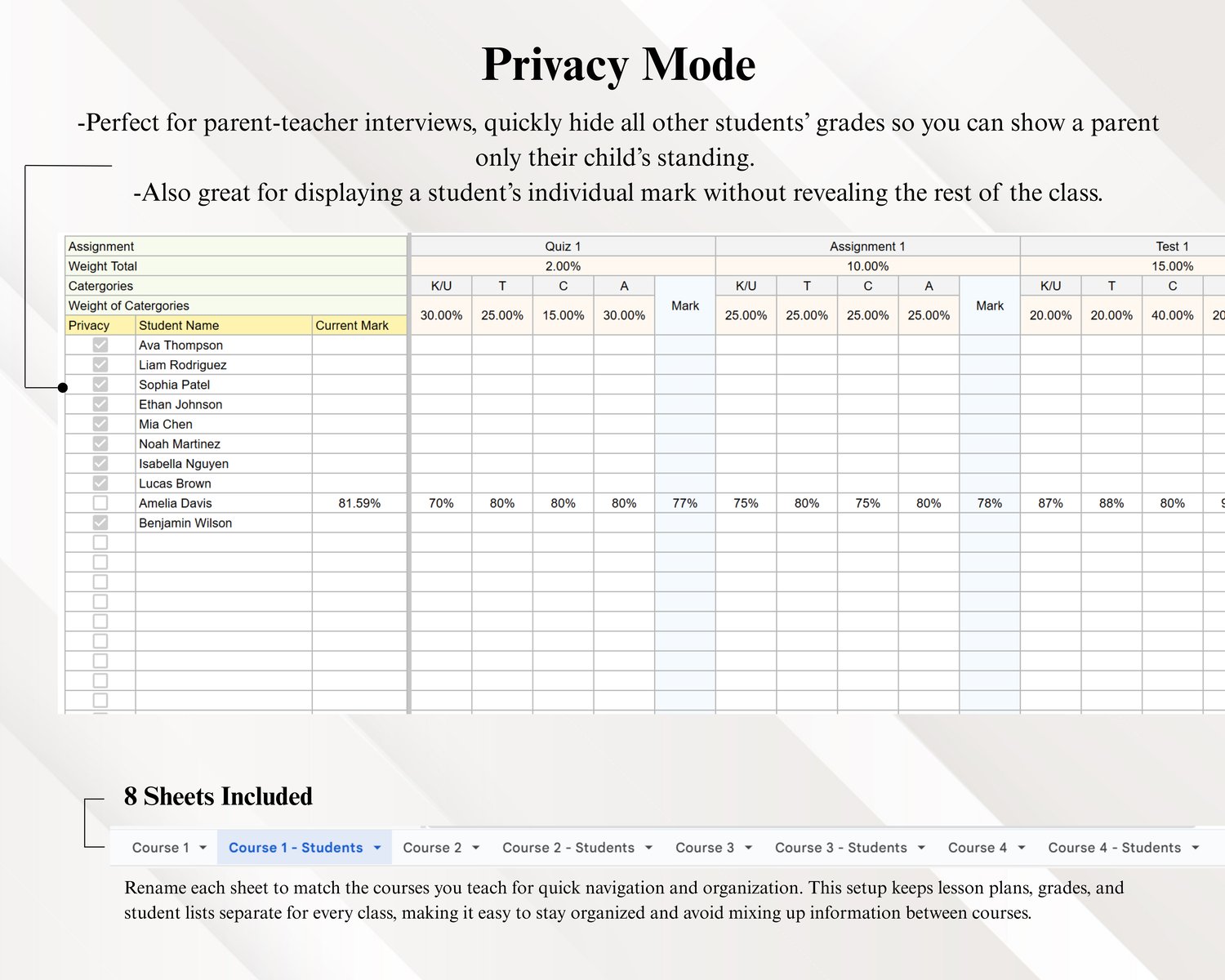 - Separate course sheets with calendars, lesson planning space, and grade trackers